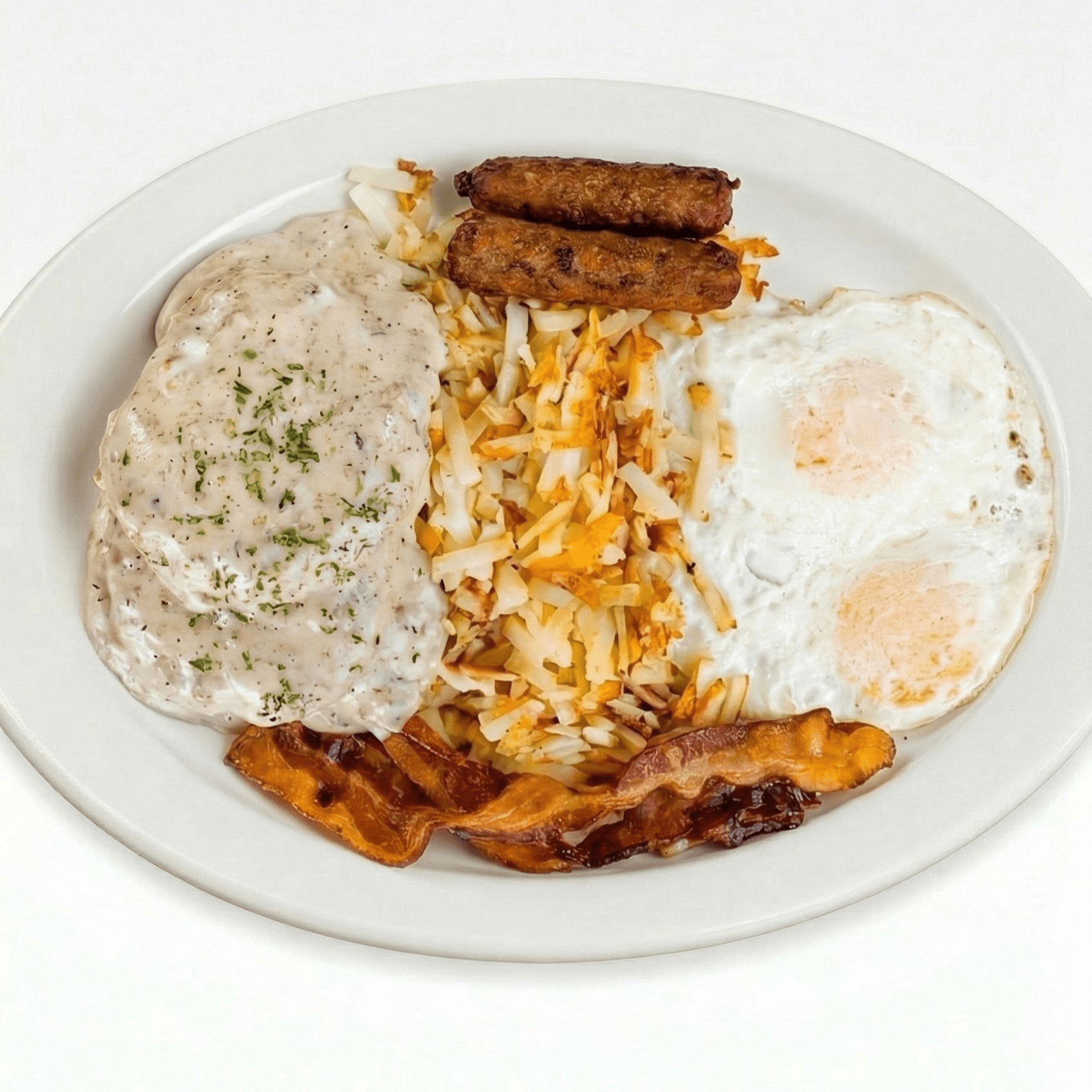 A hearty breakfast featuring a homemade biscuit with gravy, two eggs any style, smokey bacon, savory sausage links, and golden potatoes