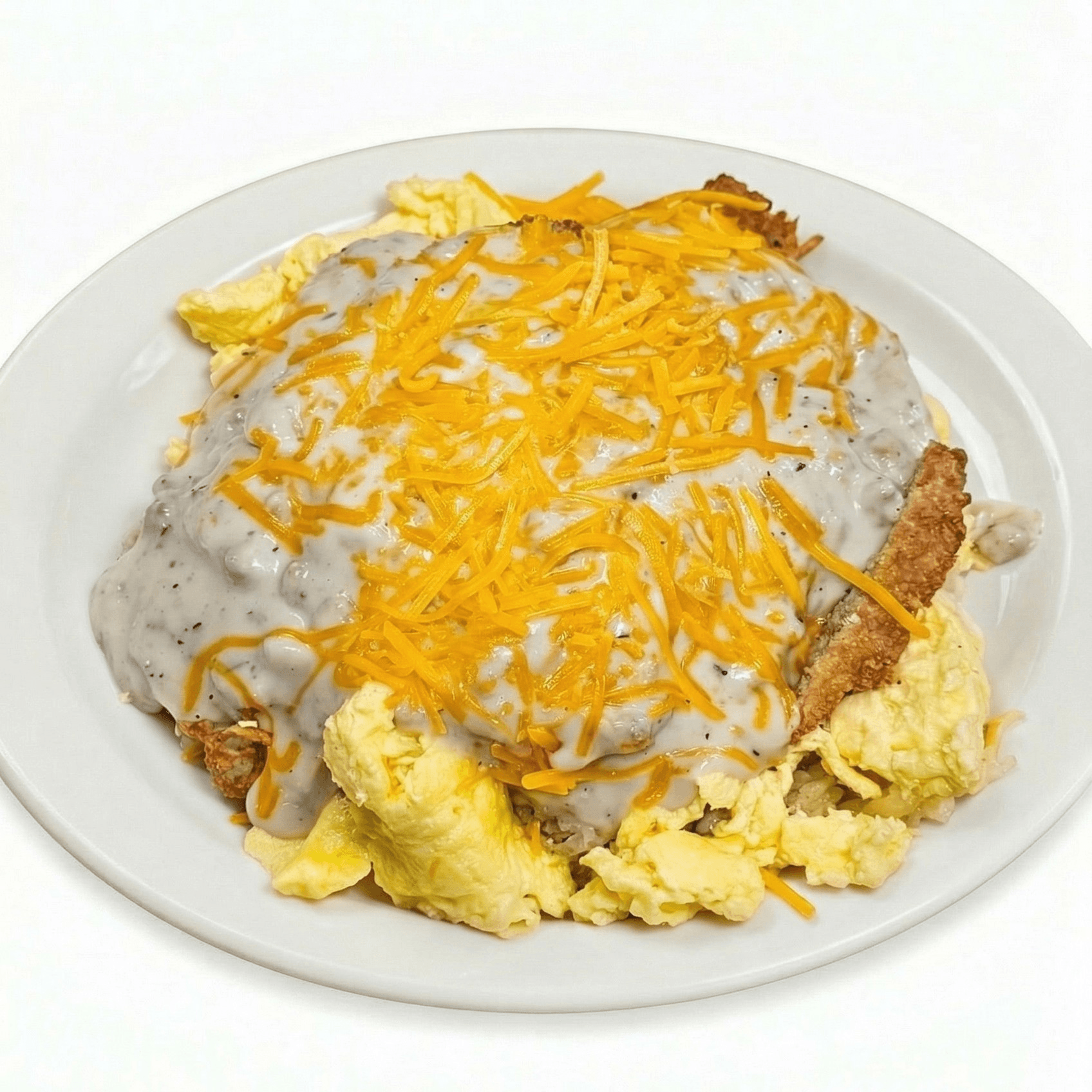 A comforting layered dish starting with a biscuit and gravy, hash browns, and scrambled eggs, then topped with our homemade corned beef, rich sausage gravy, and melted cheddar cheese