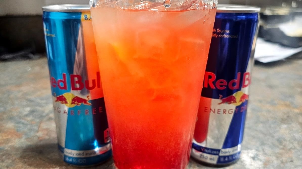 A can of Red Bull (regular or sugar free) mixed with your choice of vanilla, coconut, blackberry, raspberry, cherry, blue raspberry, peach, strawberry, watermelon, pineapple, red passion fruit, cotton candy or Hawaiian Island (passion fruit, guava, orange), and Topper choices of Lemonade, heavy cream, orange juice, pineapple or cranberry juice