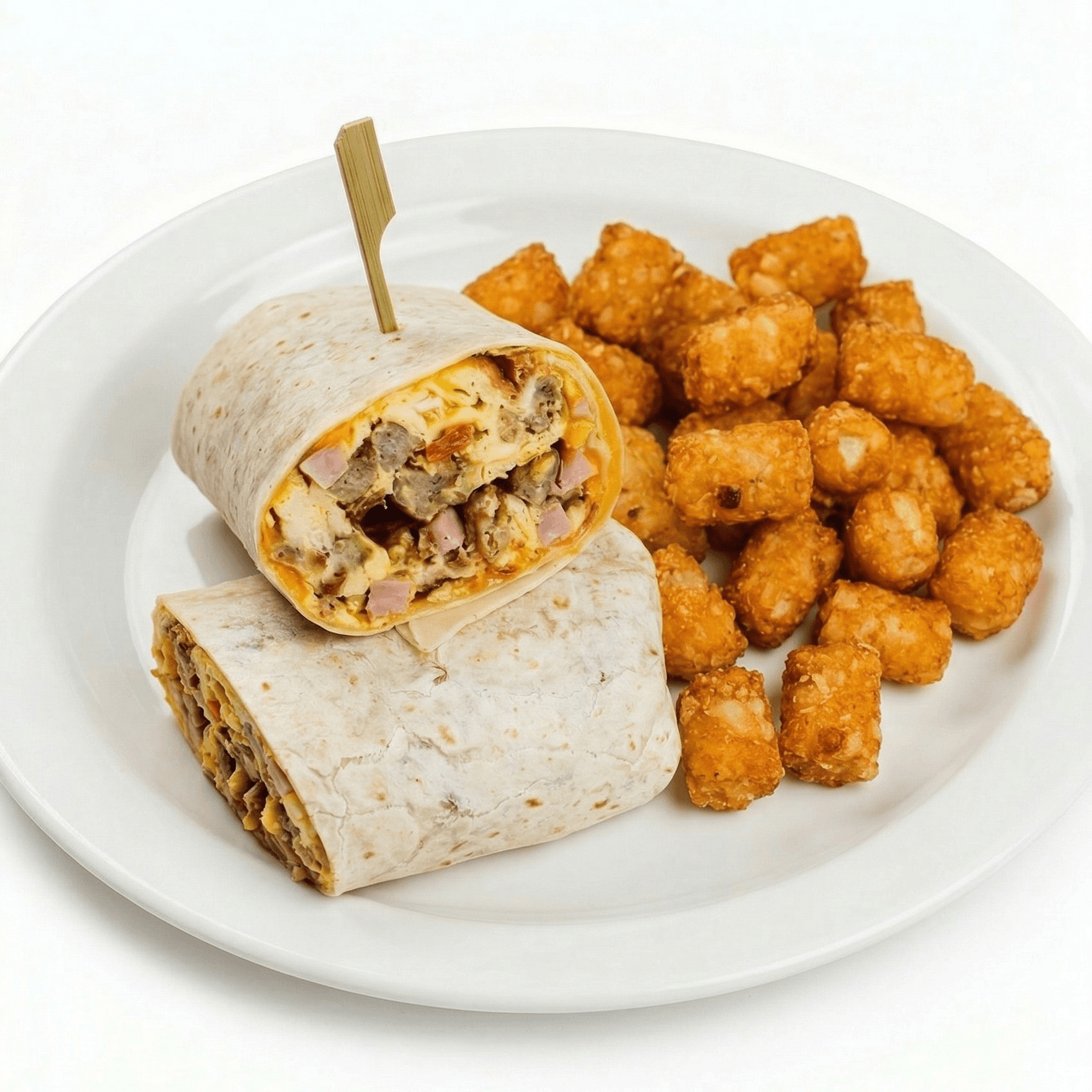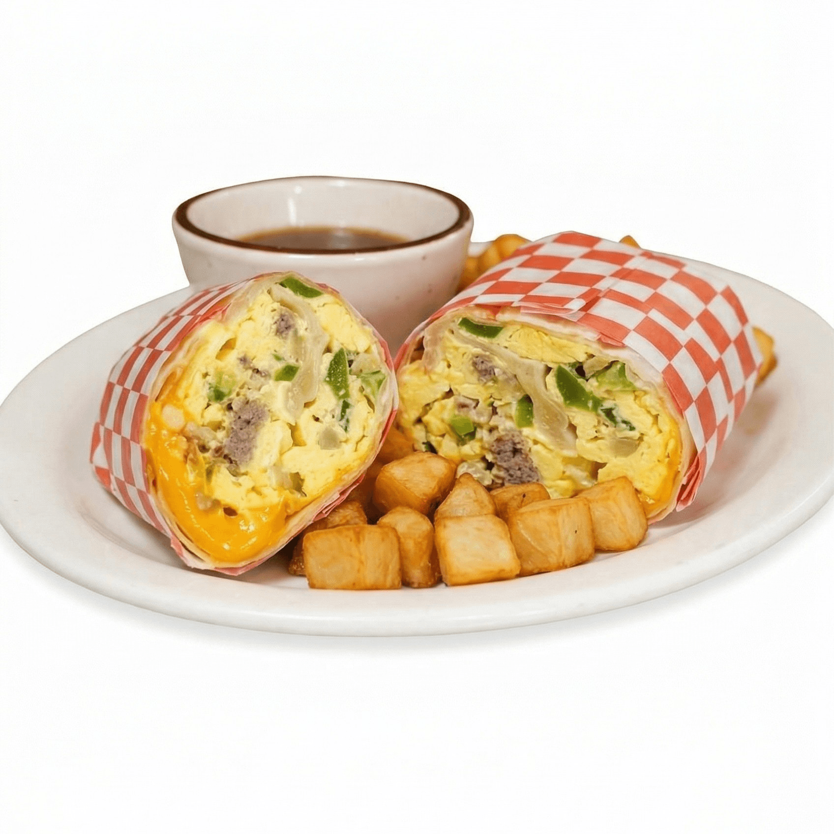 Stuffed with smoky bacon, savory sausage, diced ham, fluffy scrambled eggs, and melted cheddar cheese. Includes a side of golden-brown potatoes