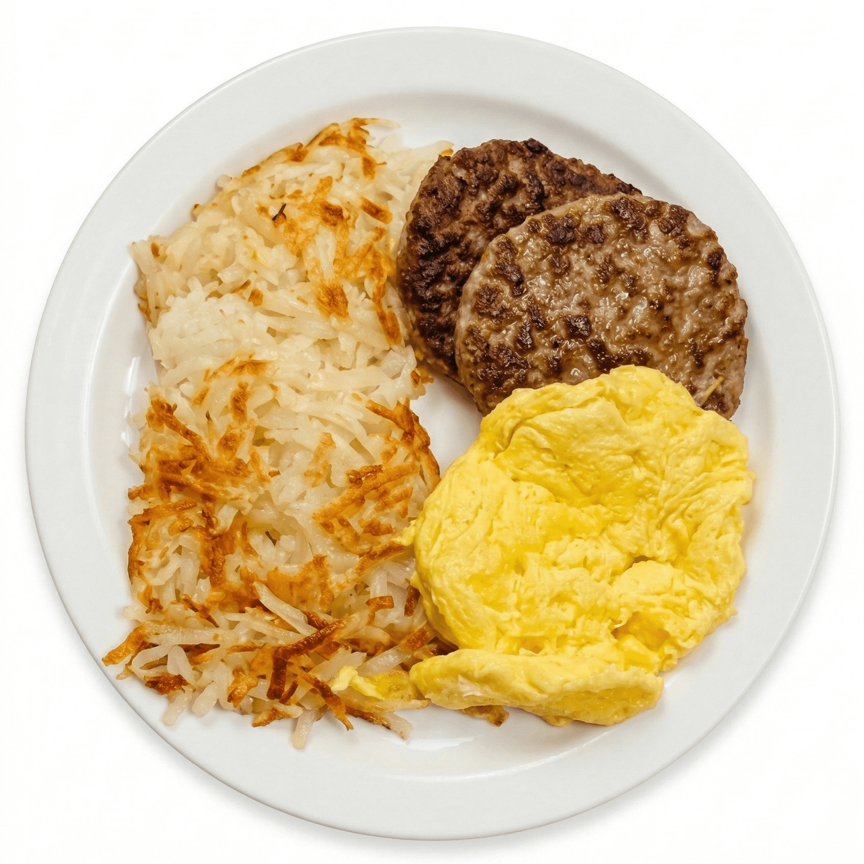 2 savory sausage patties layered with fluffy scrambled eggs, melted American cheese, and a touch of mayo, all tucked into a toasted English muffin