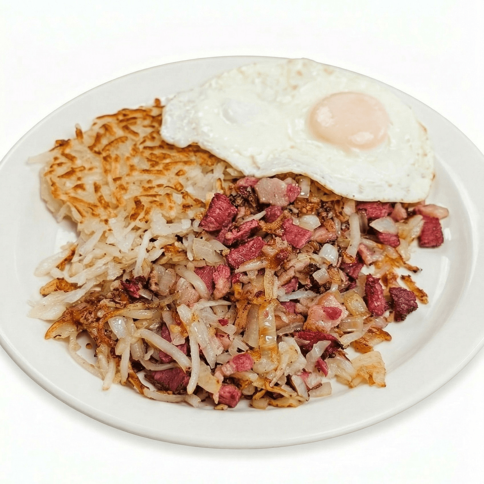 Gluten free. Tender house-braised certified angus corned beef chopped and blended with golden hashbrowns and onions