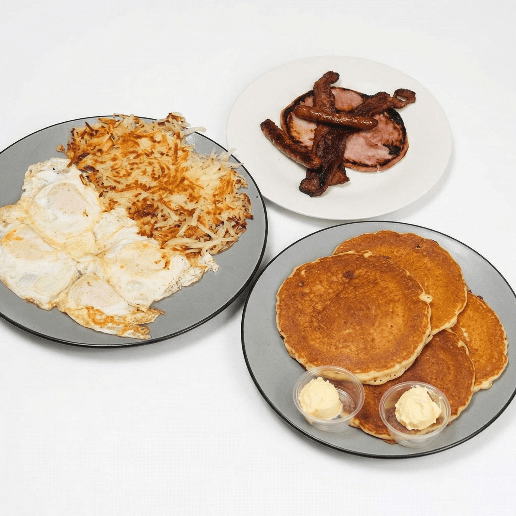 It takes three plates to serve this meal! 4 eggs any one style with sausage links, bacon, and a slice of ham. Choice of biscuits & gravy or French toast or a full stack of pancakes and choice of potatoes
