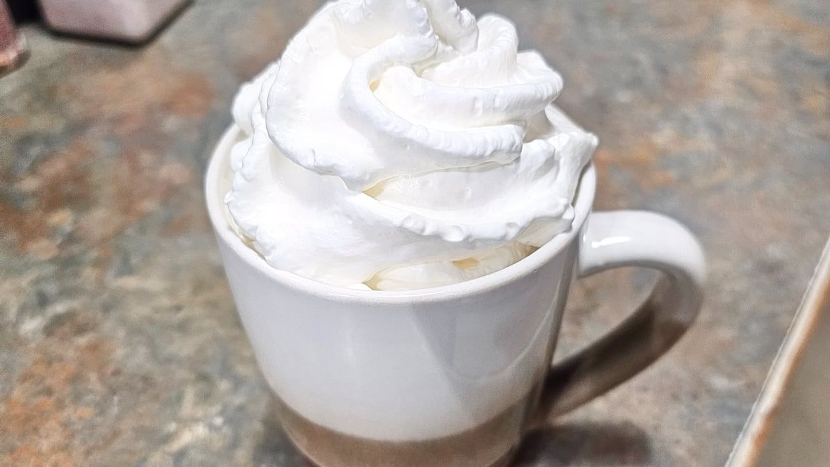 Cold brew is served over ice and topped with heavy cream and pumpkin spice syrup