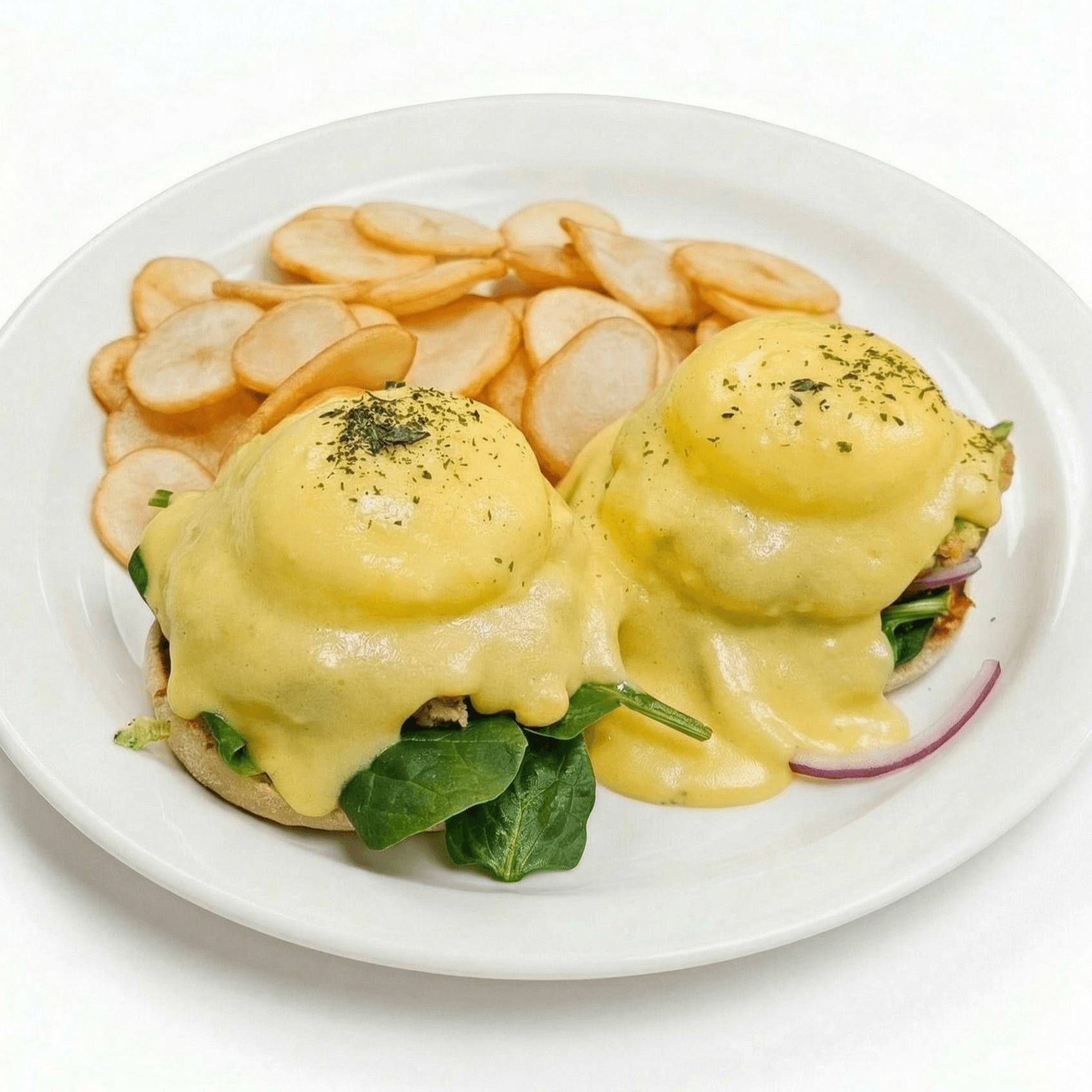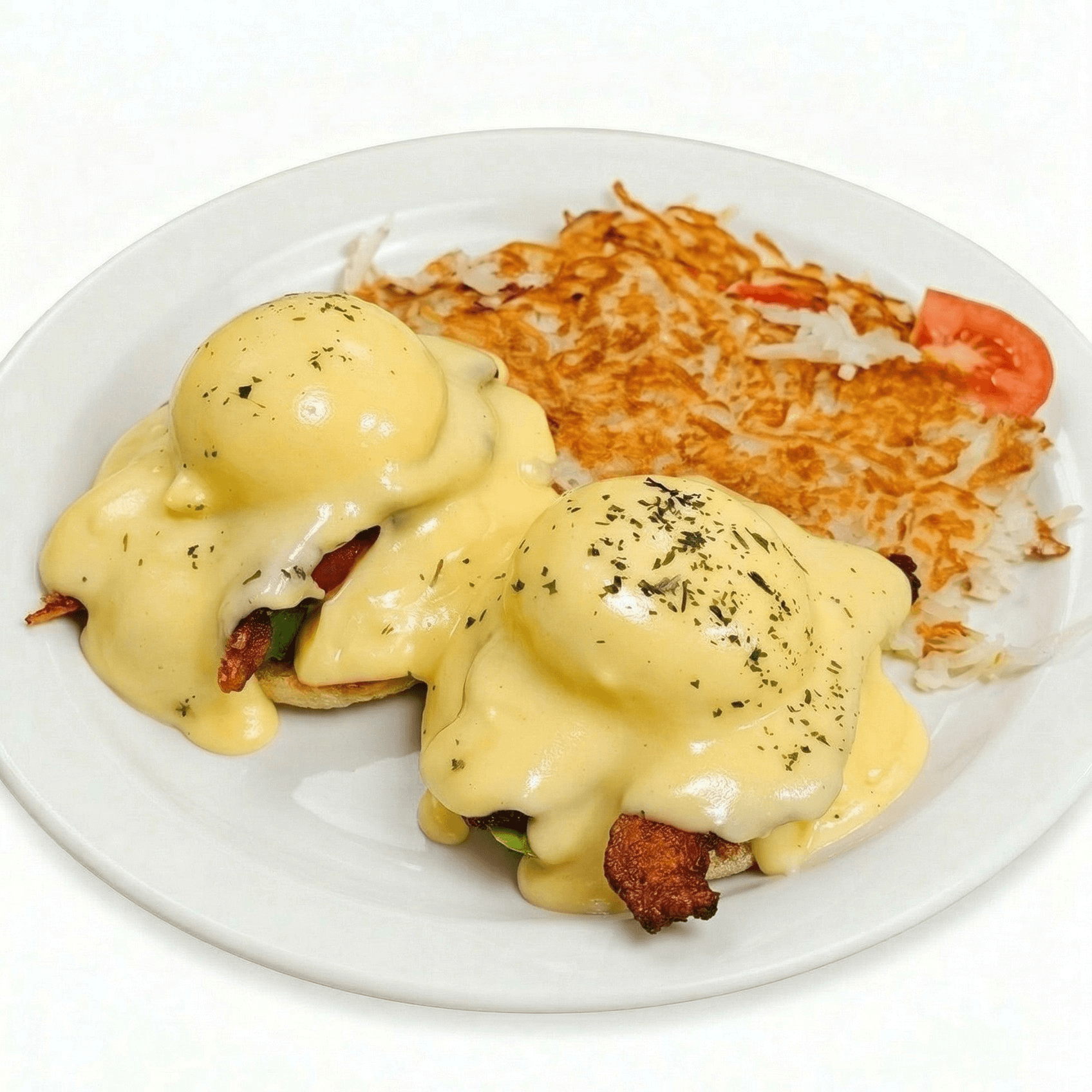 Fresh spinach and sliced tomato layered on a grilled English muffin, finished with poached eggs and creamy Hollandaise sauce