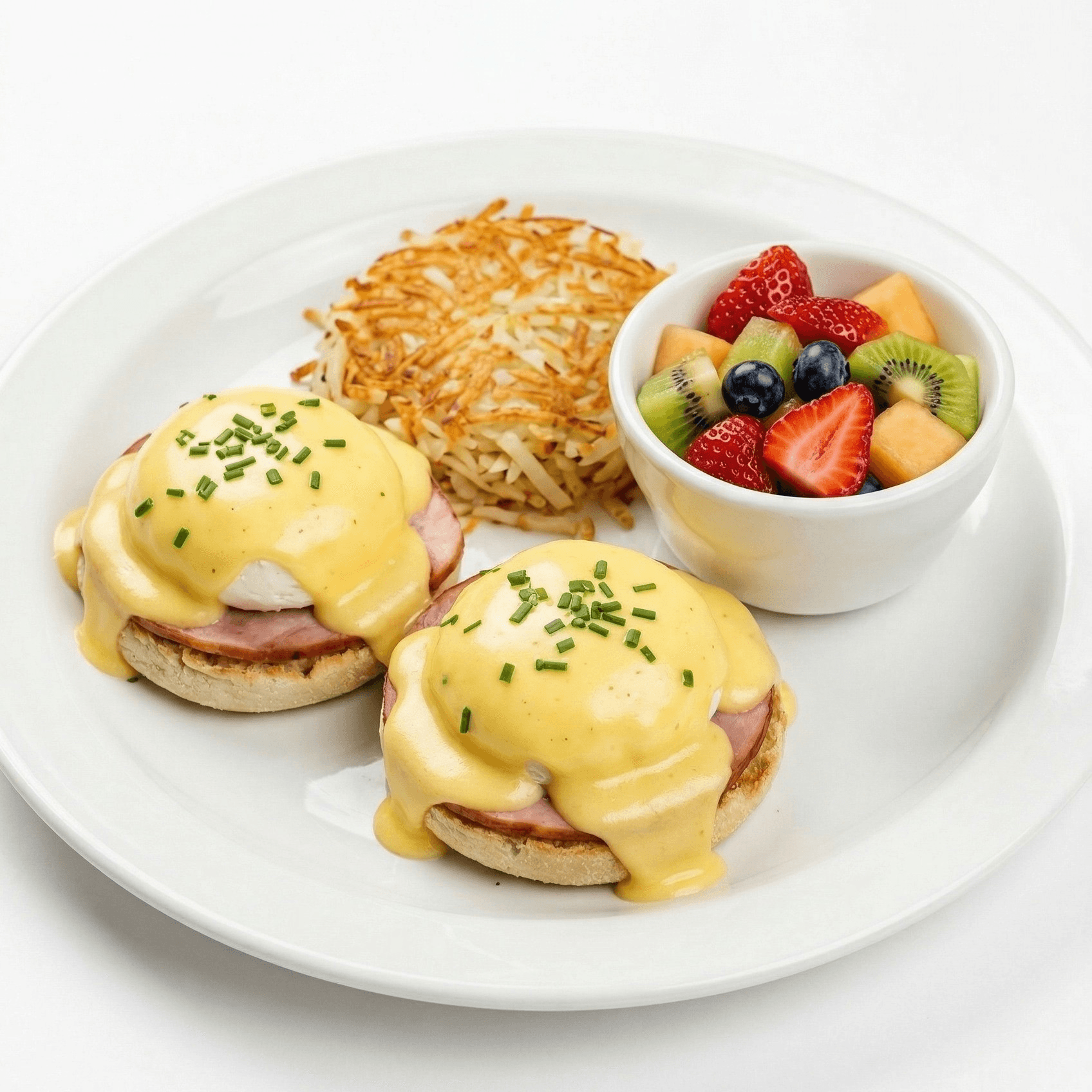 Grilled English muffin topped with Canadian bacon, perfectly poached eggs, and our rich Hollandaise sauce